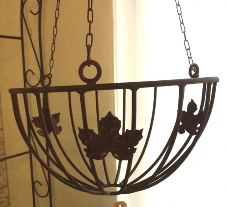 Dekorativer Hängepreis mit Blättern und Kette // Durchmesser 36 cm Höhe incl. Kette 88 cm, Höhe Korb 20 cm // Massives Volleisen // Rost: Metall nach Rostverfahren.