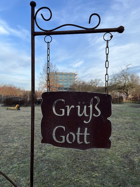 Stab mit Schild "Grüß Gott" Höhe 200cm, rost